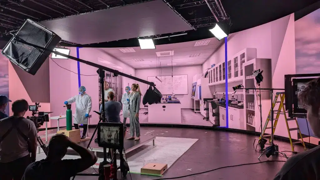 Virtual production replaces traditional green screens with huge LED panels displaying the Unreal scene right behind the set and actors.